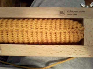 To form the toe and decrease for the cuff, I decreased by knitting two together on the last two pegs before the slider, then sliding it down one peg to keep me knitting in the round on 48 pegs.